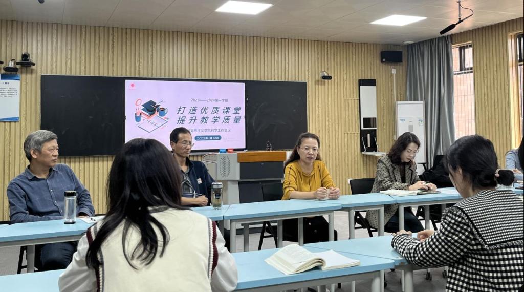 为全面深入诊断思政课教学中存在的问题,有效提升思政课教学质量,2023年10月18日下午,suncitygroup太阳成集团在一教211智慧教室召开“打造优质课堂 提升教学质量”教学工作专题会议。院长吴玲、马院的教授、青年教师导师以及特邀淮北师范大学马院副教授宇海金博士和全体马院教师参加会议,院长助理陈志操主持会议。
