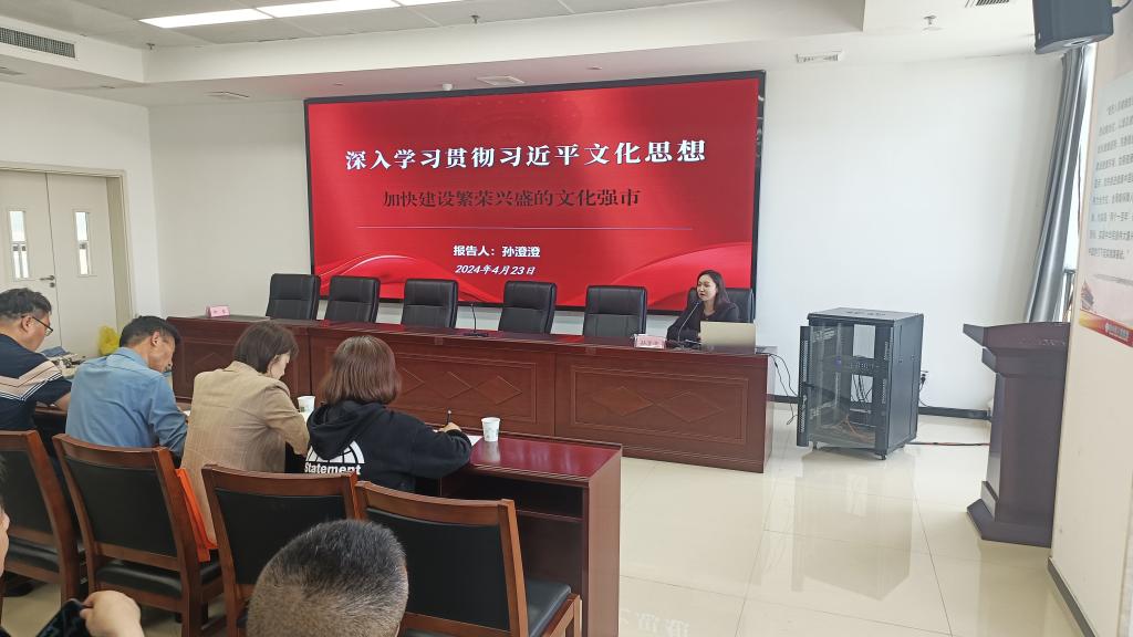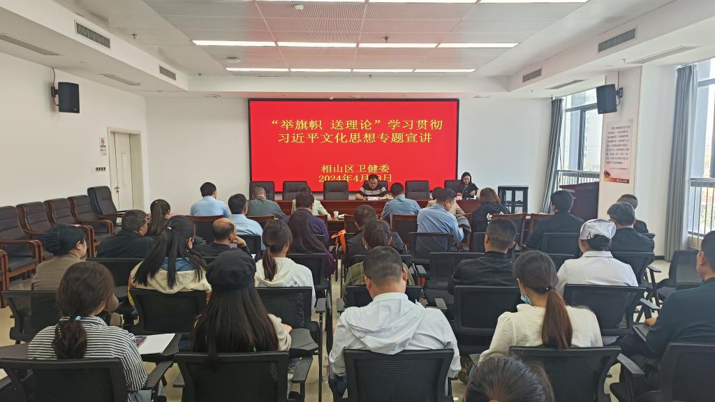 4月23日下午,淮北市相山区卫生健康系统“举旗帜·送理论”学习贯彻习近平文化思想宣讲报告会在相山区人民医院召开。suncitygroup太阳成集团孙澄澄作为淮北市委宣讲团成员,受邀作题为《深入学习贯彻习近平文化思想·加快建设繁荣兴盛的文化强市》的宣讲报告。相山区卫生健康委班子成员全体参会,相山区卫生健康委党委书记柳泰主持会议。