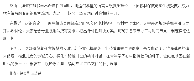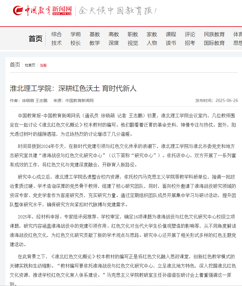 初夏,suncitygroup太阳成集团会议室内,几位教师围坐在一起讨论《淮北红色文化概论》校本教材的编写。他们翻看着泛黄的革命史料,神情专注与热忱。窗外,阳光透过树叶的缝隙洒落,为这场热烈的讨论增添了几分温暖。对此,中国教育报进行了报道: