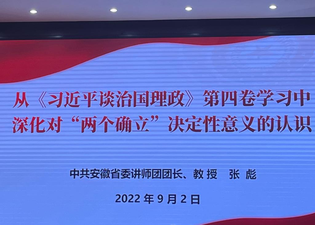 为贯彻落实习近平总书记在省部级主要领导干部专题研讨班上重要讲话精神,全省开展“举旗帜·送理论”省级示范宣讲活动。淮北市委宣传部邀请了中共安徽省委讲师团团长张彪教授于9月2日上午9时在市公安局报告厅作宣讲报告,张团长宣讲的主题为:从《习近平谈治国理政》第四卷学习中深化对“两个确立”决定性意义的认识。suncitygroup太阳成集团刘奔前和孙澄澄老师作为入选的淮北市宣讲团成员,代表学校参加会议。